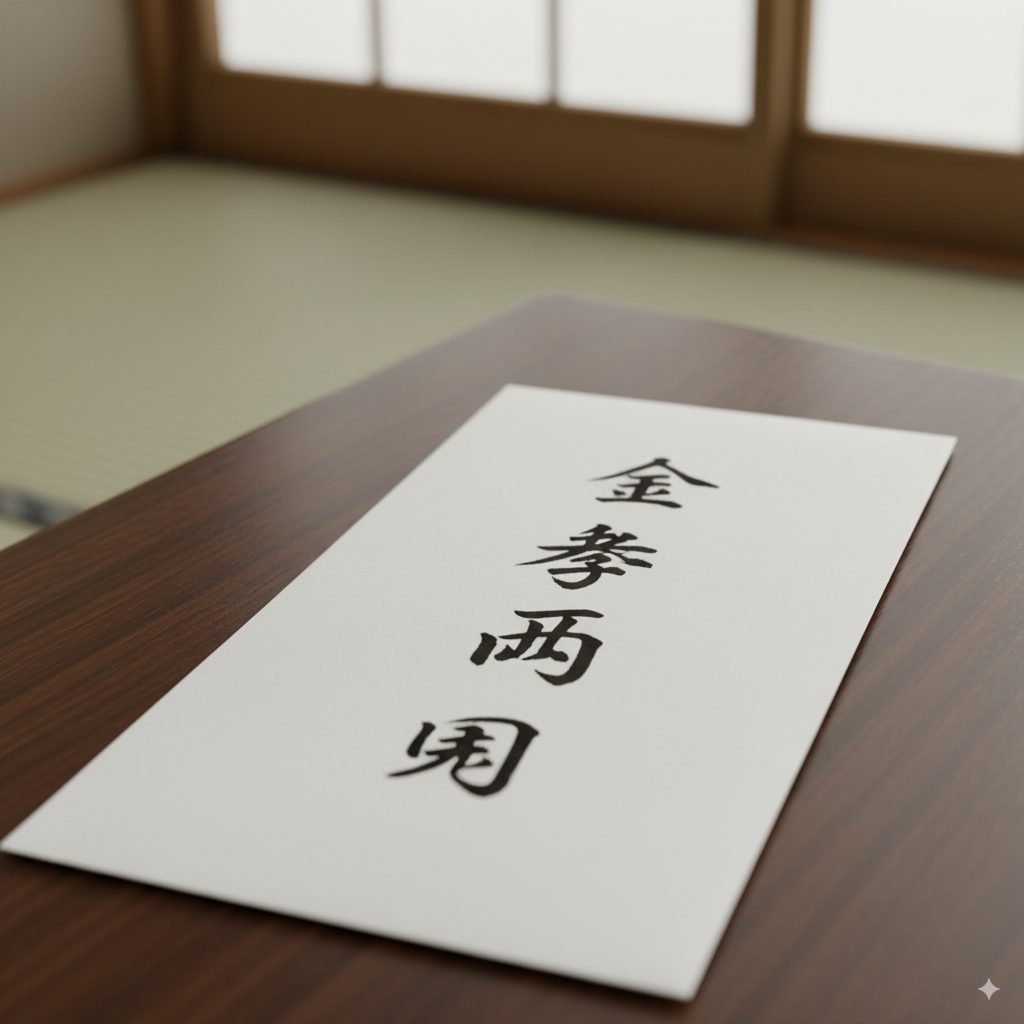 次は、お金を入れる中袋(または中包み)の番。表側には、包んだ金額を縦書きで書くんだ。この時、普通の漢数字じゃなくて、「壱、弐、参…」といった旧漢字(大字)を使うのが正式なマナーだよ。